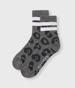 Calcetines acanalados con estampado de leopardo y logotipo bajo el pie. Diseño con puño acanalado y detalles de lúrex plateado brillante.