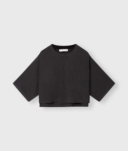 Suéter corto de corte relajado, confeccionado en felpa ligera de algodón clásica. Presenta cuello acanalado, hombros caídos con detalles de pliegues, pequeñas aberturas laterales en el bajo, una etiqueta transparente de 10DAYS en la espalda y un monograma "10" bordado en la manga izquierda.